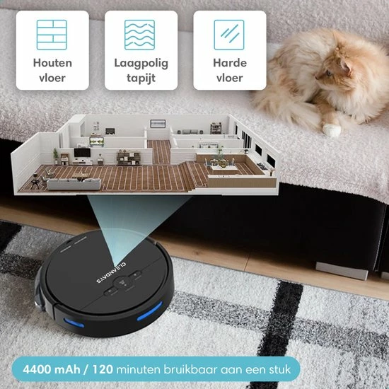 Met een ruime batterijcapaciteit van 4400 mAh en gebruiksduur van 120 minuten kan de robotstofzuiger de meest ruime oppervlaktes aan. Is het apparaat leeg? Maak je geen zorgen, bij een batterijpercentage van minder dan 20% keert het apparaat automatisch terug naar het oplaadpunt.