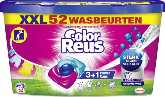 Color Reus Power Caps is een uniek voorgedoseerd wasmiddel voor gekleurde kleding, dat geweldige wasresultaten biedt voor een scherpe prijs. Het combineert drie sterke krachten in 3 kamers van één capsule voor hygiënisch schoon wasgoed. Dankzij de unieke reinigingstechnologie, zorgen deze verschillende krachten voor Reuzenwaskracht, Stralend Schoon en Fris wasgoed en is Extra sterk tegen vlekken, zelfs bij lage temperaturen. De Color Reus Power Caps hebben een handige voorgedoseerde vorm en kunnen worden gebruikt voor uw wasgoed van 20 tot 60° C.