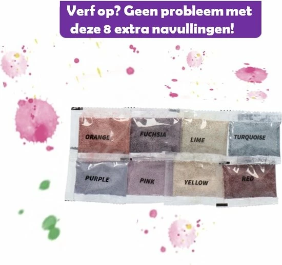 - 8 hervulbare knijpflesjes inclusief kleurstof (120 ml per stuk)