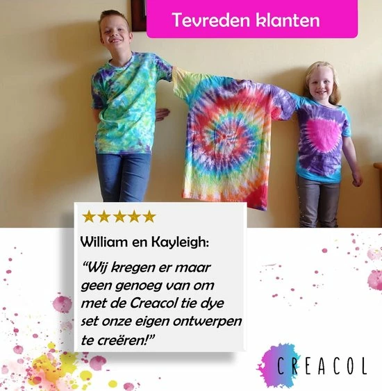 Wil jij de toffe doe-het-zelf tie dye trend absoluut niet missen en vele leuke projecten maken? Dan is deze alles in 1 tie dye kit van CREACOL precies wat jij nodig hebt! Met deze set met maar liefst 8 verschillende kleuren kun je direct aan de slag en heb je gegarandeerd veel dye-plezier!