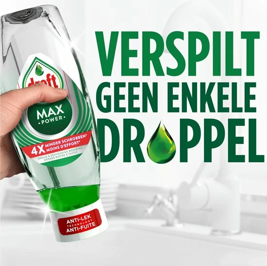 Dreft MaxPower vloeibaar afwasmiddel wordt geleverd in een ondersteboven fles zonder flipdop, zodat je kunt schoonmaken zonder gedoe. Het maakt de afwas snel en eenvoudig, zodat je sneller klaar bent in de keuken.