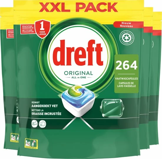 Dreft Original All in One vaatwascapsules leveren direct een grondige reinigingsactie en zijn zelfs effectief op aangekoekt vet, voor een sprankelend schone vaat. Dreft combineert vloeistof en poeder in één krachtige capsule. Het ultra-oplosbare zakje lost snel op, zodat het snel begint te reinigen om de klus klaar te krijgen. En ze zijn gemakkelijk te gebruiken. Plaats ze gewoon in het doseerbakje van je vaatwasser, met verpakking.