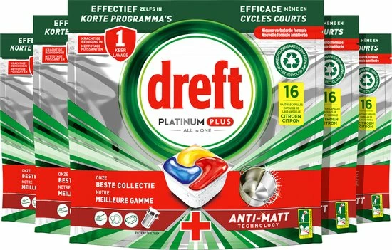 Dreft Platinum Plus All in One vaatwascapsules zorgen voor een reiniging als nieuw, het geeft je Dreft’s beste collectie voor het reinigen van hardnekkig voedsel en het helpt zelfs de dofheid weg te nemen die in de loop van de tijd is opgebouwd, om de oorspronkelijke glans van je vaatwerk te herstellen. Dreft Platinum Plus geeft je een uitmuntende reiniging en verwijdert hardnekkige voedselvlekken, zelfs in de testconditie van een korte cyclus. Dus, als je weinig tijd hebt, is er niets aan de hand. Schakel over op kort. Dreft combineert vloeistof en poeder in één krachtige capsule. Het ultra-oplosbare zakje lost snel op en werkt goed in korte cycli omdat het snel begint te reinigen om de klus klaar te krijgen. En ze zijn gemakkelijk te gebruiken. Plaats ze gewoon in het doseerbakje van je vaatwasser, met verpakking. Schakel over op de korte cyclus* en bespaar tijd, energie en water in vergelijking met een gewone, standaard cyclus!