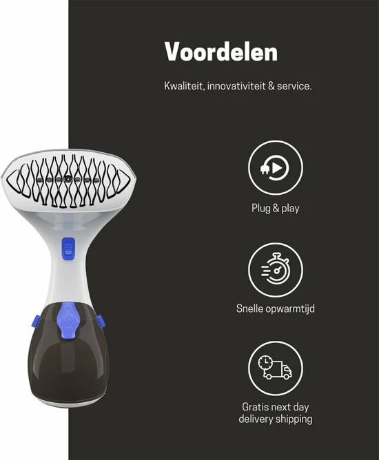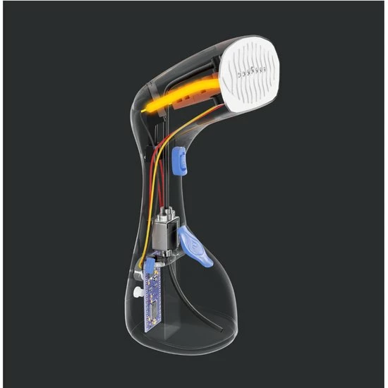 De kleurstelling van deze moderne kledingstomer is wit, zwart met blauw accenten. Deze stomer wordt geleverd met een duidelijke handleiding.