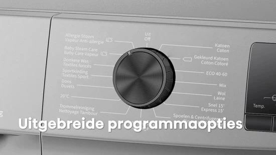 Dankzij de vele opties geef je jouw kleding altijd een wasbeurt naar wens. Je gaat bijvoorbeeld voor een programma voor wollen kleding, voor een extra snel programma of voor een speciaal allergieprogramma.