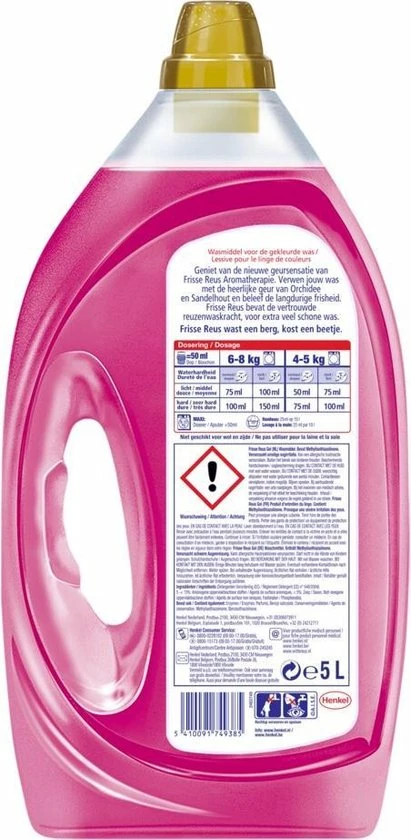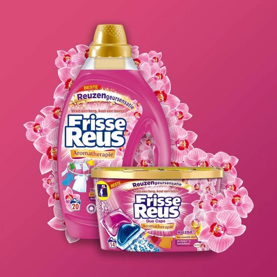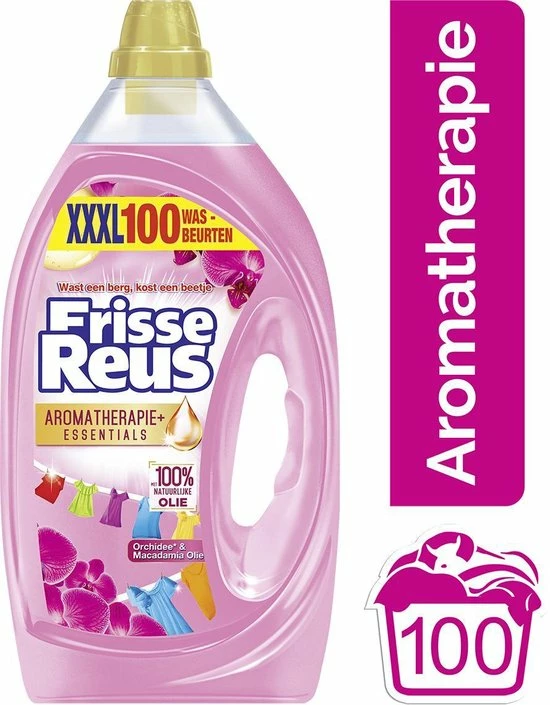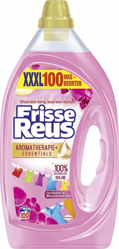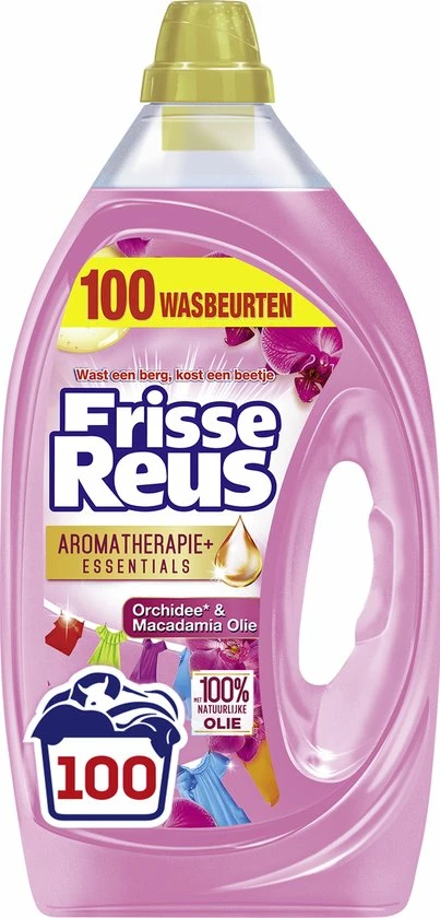 Frisse Reus Aromatherapie Orchidee Macadamia vloeibaar wasmiddel is het ideale wasmiddel voor gezinnen. Dankzij zijn waskracht is hij extra sterk tegen vlekken en werkt hij al vanaf 20 graden Celsius. Het resultaat? Een stralend schone gekleurde en bonte was! Door de hoogwaardige parfumtechnologie krijg je nu een heerlijke, langdurige frisse geur van orchidee en sandelhout in jouw kleding. Daarnaast is Frisse Reus milieuvriendelijk vanwege zijn lage energie- en waterverbruik. Het wasmiddel is speciaal ontwikkeld voor de gekleurde en bonte was. Frisse Reus wast een berg, kost een beetje!