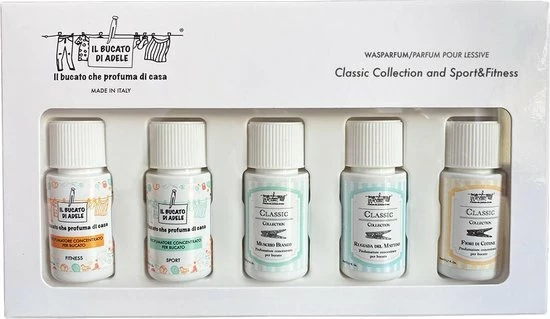 De doos Wasparfum met 5 geuren bevat: Fitness – Sport – Witte Musk – Ochtenddauw – Katoenbloem in een praktisch formaat voor een enkele dosis waarmee u ze kunt proberen voordat u het 500 ml-formaat koopt.