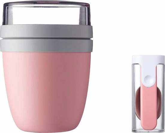 De inhoud van de bovenste transparante container is 200 ml, dit betekent dat er ongeveer 75 gram muesli of fruit in past. De capaciteit van de onderste container is 500 ml, genoeg voor een royale noedels of yoghurt. De lunchpot van Mepal kan ook gebruikt worden als soep beker to go. De yoghurt beker is gemaakt van duurzaam materiaal en mag gebruikt worden in de vriezer, de magnetron (verwijder wel de deksel) en vaatwasser. De bovenste transparante container mag niet gebruikt worden in de magnetron.