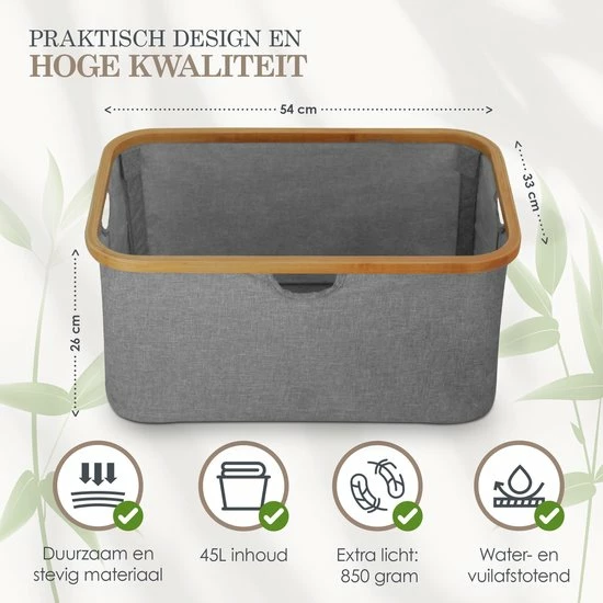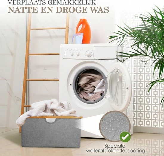 De MIRI wasmand geeft, met zijn 45L inhoud, ruimte aan een complete machinelading natte of droge was. Het textiel waaruit de wasmand bestaat is bewerkt met een speciale coating waardoor deze 100% water- en vuilafstotend is. In het bamboe frame zijn 3 handvatten aangebracht zodat de mand ook gemakkelijk op te pakken en te verplaatsen is met één hand. Deze heupwasmand zorgt voor enorm veel gemak!