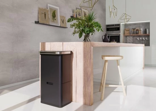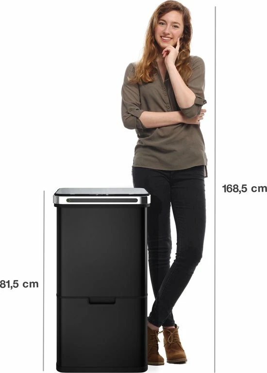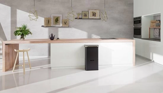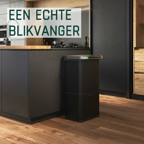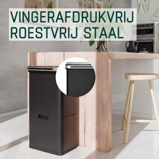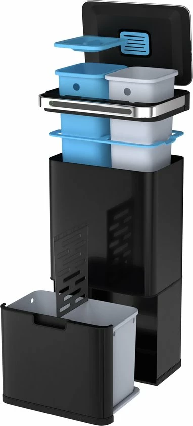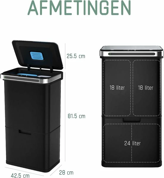 In de schuiflade aan de onderzijde bevindt zich een compartiment van 24 liter. Dit vak is eenvoudig op te splitsen in 2 vakken van 12 liter door middel van de optionele scheidingswand. - PRAKTISCHE BEDIENING – Het is mogelijk om de bovenste twee compartimenten volledig contactloos te vullen. De sensor in de deksel opent automatisch zodra je in het bereik van 20 cm komt. Na 5 seconden sluit de deksel zich automatisch weer. De deksel is tevens handmatig te openen door een druk op de knop. De rolbare lade aan de onderzijde glijdt per handgreep naar voren en terug.