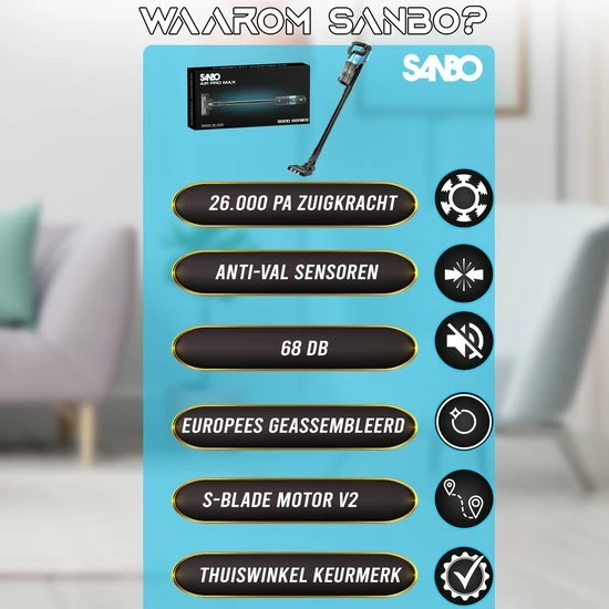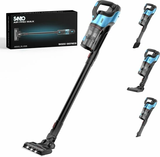 Haal nu de snelste, makkelijkste en beste manier van stofzuigen in huis. Geen last meer van vervelende kabels tijdens het schoonmaken van moeilijk bereikbare plekken met de SANBO Air Pro Max 9000 Series V2. Bij de steelstofzuiger zitten 3 unieke opzetstukken waardoor u alle benodigdheden heeft om het gehele huis of zelfs uw auto met 1 apparaat stof en vuil vrij te krijgen. Door de grote container van 0,6L leeg je met รฉรฉn druk op de knop de afvalbak van de Air Pro Max en kunt u zorgeloos verder stofzuigen zonder dat u zich zorgen hoeft te maken over het vervangen van de stofzak. โจ