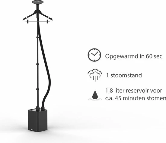 Afneembaar waterreservoir aanwezig van 1,8 liter. Hierdoor kan er ruim 45 minuten aaneengesloten gestoomd worden.