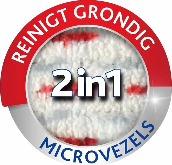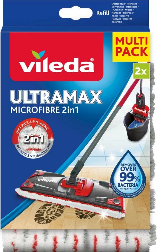 Hoes in microvezels met het UltraMax systeem van Vileda te gebruiken:◦Witte microvezel voor een resultaat zonder strepen en om het vuil met het hele oppervlak van de mop op te nemen◦Vileda-vezels in rood polyamide om het vuil beter los te maken en op te nemen.